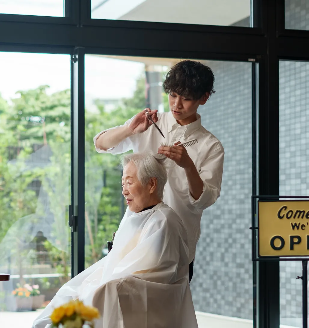そよ風訪問美容サービスは、介護施設や病院などをメインに、お客様に喜んでいただけるよう髪型やメニュー、
